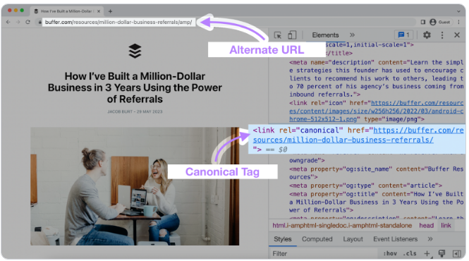 规范标签位于网页 HTML 源代码的 <head> 部分,如下所示: