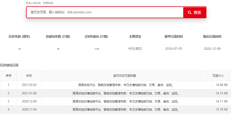 2.输入框输入想查询的网站,点击【搜索】即可查询历史,可以了解这个域名的最初注册时间,中间被删除了多少次,历史页面标题等。