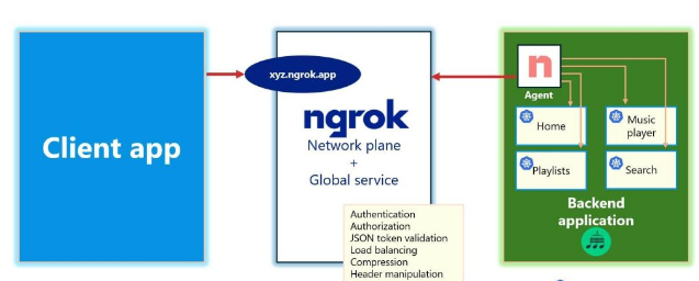 Argha 绘制的模型表示客户端应用程序与使用 ngrok 代理构建的订阅音乐服务之间的网络交互。Ngrok 的 API 网关管理音乐服务的流量,代理将请求转发到应用程序内的各个服务。